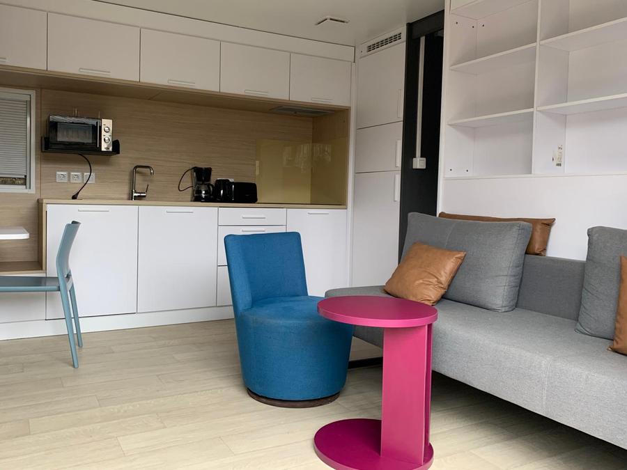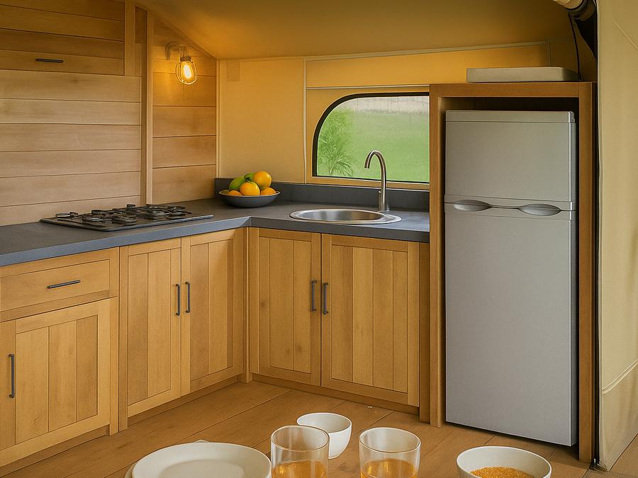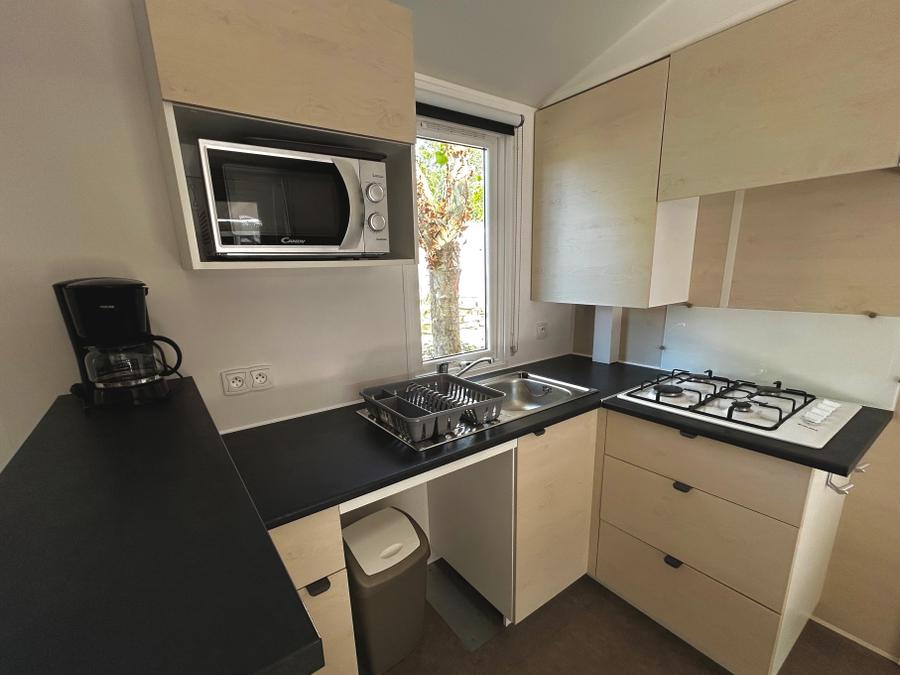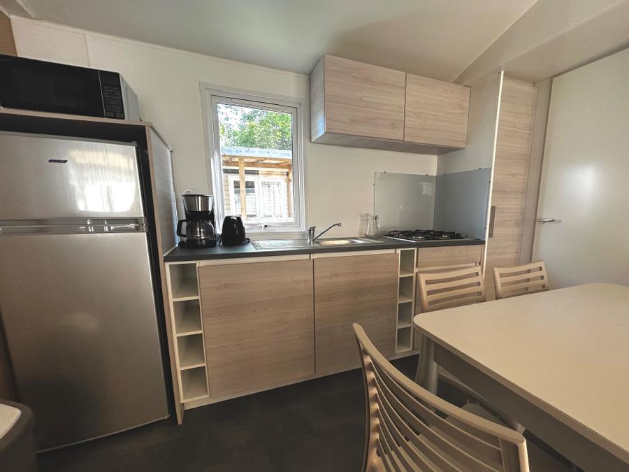 La cuisine est entièrement équipée : plaque gaz, réfrigérateur avec congélateur, évier, micro-ondes, cafetière et bouilloire – tout le nécessaire pour préparer vos repas en toute autonomie.
