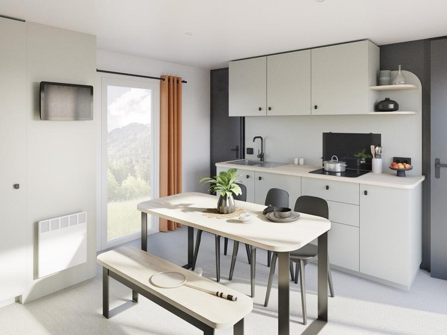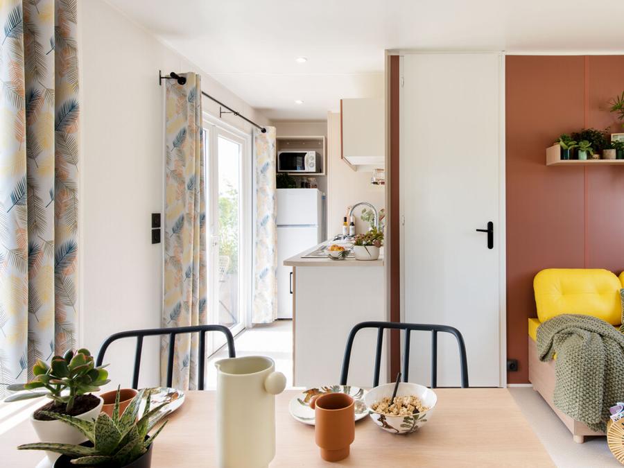La pièce de vie lumineuse avec télévision invite à la détente, tandis que la cuisine équipée ouverte sur la terrasse ou placée au cœur du mobil-home favorise les moments de partage. Chaque détail est pensé pour la convivialité : grande table, coin salon confortable et circulation fluide.