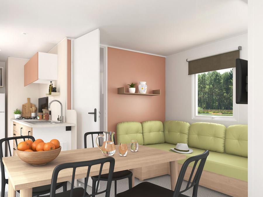 À l'intérieur du mobil-home Life, vous trouverez une pièce de vie avec TV, climatisation et un espace repas avec une banquette convertible (110x190).