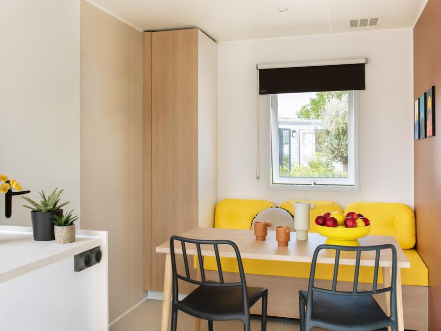 À l'intérieur du mobil-home Life, vous trouverez une pièce de vie avec TV, climatisation et un espace repas avec une banquette convertible (110x190).