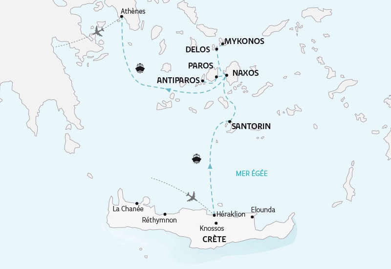 De Minos à Délos, ce voyage conjugue quelques-unes des plus belles îles de Grèce. Outre la Crète vous pourrez admirer l'exceptionnelle Santorin, la douce Naxos, la placide Antiparos, la marmoréenne Paros, la hiératique Délos et la turbulente Mykonos. Ajoutez un zeste d'Athènes et de son musée de l'Acropole : vous avez là de quoi appréhender le miracle grec.
