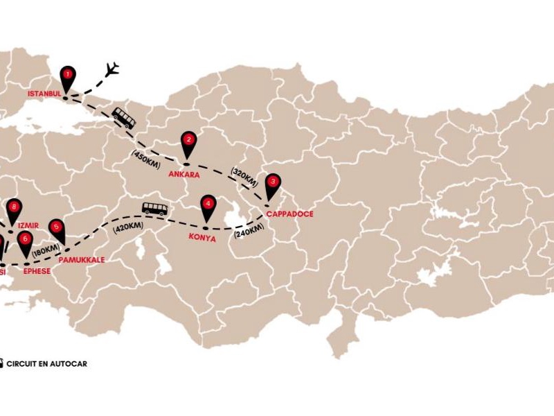 Ce circuit complet vous offre non seulement une immersion totale dans l’histoire et la culture de la Turquie, mais aussi la possibilité d’options exclusives, telles qu’une promenade en bateau sur le Bosphore ou un vol en montgolfière au-dessus des paysages fantastiques de la Cappadoce. Laissez-vous tenter par ce voyage unique, oé chaque étape est une découverte, chaque lieu une merveille.