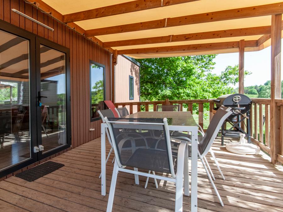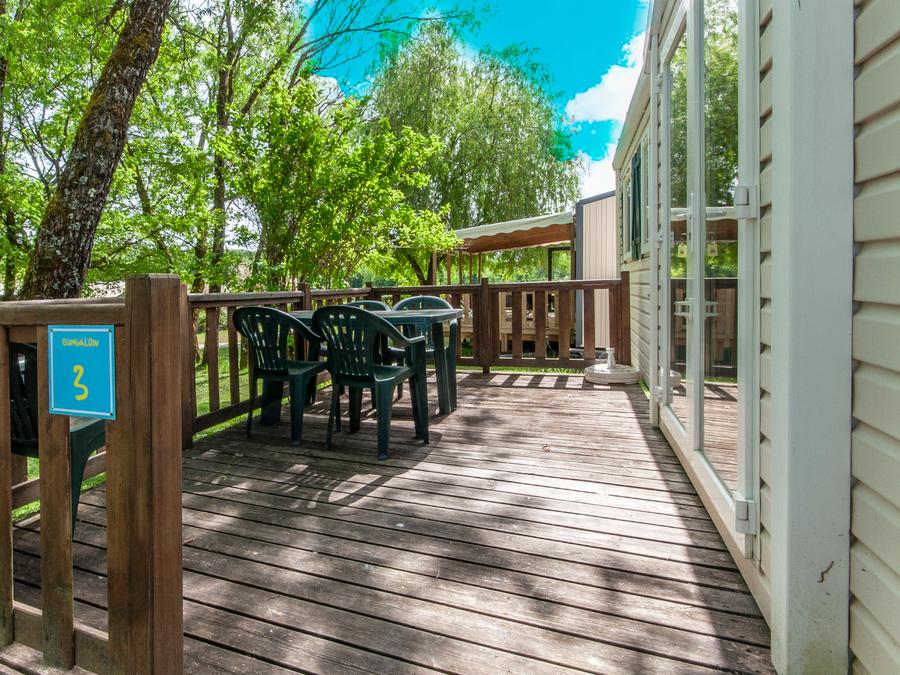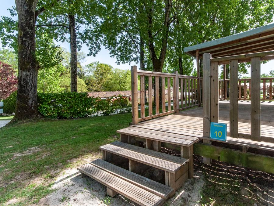 Terrasse en bois non couverte ou semi couverte (selon le modèle).