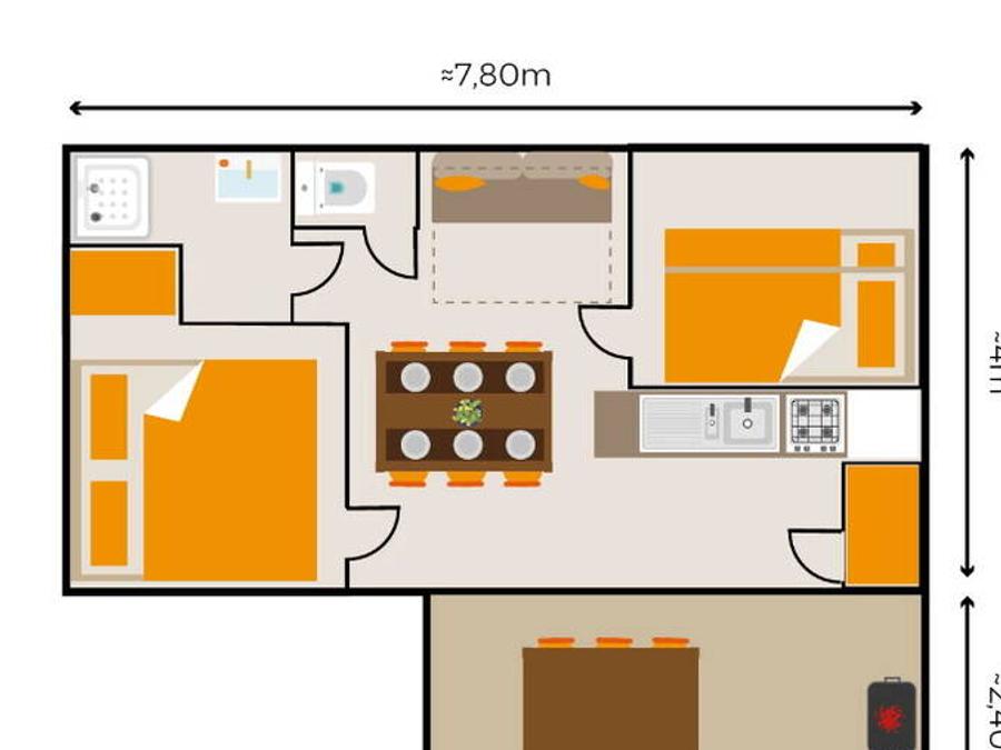 Mobilhome 8 personnes - Mobil-home | Comfort | 3 Ch. | 6/8 Pers. | Terrasse surélevée | 1 SDB | Clim. | TV