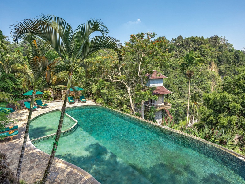 Chaque villa possède sa piscine privée à débordement de 30 m², avec chaises longues et vue sur la rivière Ayung.