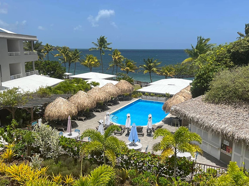 En face de l’océan avec accès direct à la plage ce qui au diamant n’est pas si évident. Personnel agréable et chambre propre au quotidien. La houle a creusé l’accès à la plage et des réparations s’imposent car cela nuit à la beauté du site. Ne prenez pas les chambres des extrémités des bâtiments car l’eau des douches est capricieuse et vous risquez de vous retrouvez savonné mais sans eau pour vous rincer. Ne pas prendre de demi pension car carte peu fournie vous fera regretter. Néanmoins bel endroit avec piscine