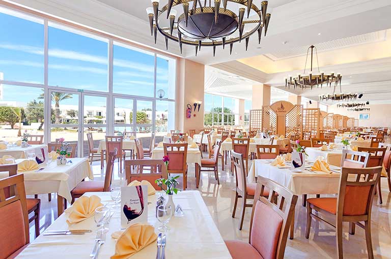 Restaurant Buffet « LES ROSIERS » : salle climatisée, cuisine tunisienne et internationale proposées en buffets - chaud et froid - variés et à thèmes.Horaires : petit-déjeuner de 6h à 10h - déjeuner de 12h30 à 14h30 - dîner de 18h30 à 21h30.